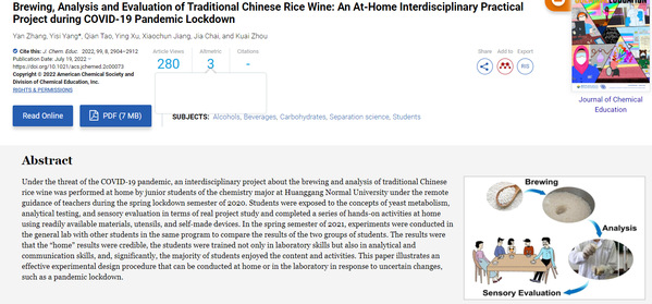 本网讯 近日,我校化学化工学院张龑、杨一思老师在化学教育类国际重要期刊《Journal of Chemical Education》上发表了题为《Brewing, Analysis and evalsuation of Traditional Chinese Rice Wine: An At-Home Interdisciplinary Practical Project during COVID-19 Pandemic Lockdown》的教学研究论文(J. Chem. Educ. 2022, 99, 8, 2904–2912. DOI: https://doi.org/10.1021/acs.jchemed.2c00073),国产精品永久久久久久久久久|91精品无码国产在线观看一区|久久人爽爽人爽爽ąV无码自慰|最新无码国模国产在线|2020最新无码国产在线观看化学化工学院为唯一完成单位。这也是继2021年两位教师在《Journal of Chemical Education》发表我校首篇化学专业教学研究SCI期刊论文后的第二篇论文。