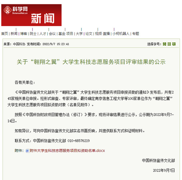 “翱翔之翼”大学生科技志愿服务项目由中国科协宣传文化部按照《中国科协 教育部 共青团中央 中央文明办关于联合开展高校大学生科技志愿服务工作的通知》总体部署,重点面向高校、科技场馆、科普教育基地等单位进行征集,对有创新、有特色的大学生科技志愿服务优秀项目给予资助激励,以提升大学生科技志愿服务工作的质量和效益。本次项目征集共有全国245家相关单位申报项目,经形式审查、专家评审,最终确定南京信息工程大学等100家单位作为“翱翔之翼”大学生科技志愿服务项目拟资助对象。